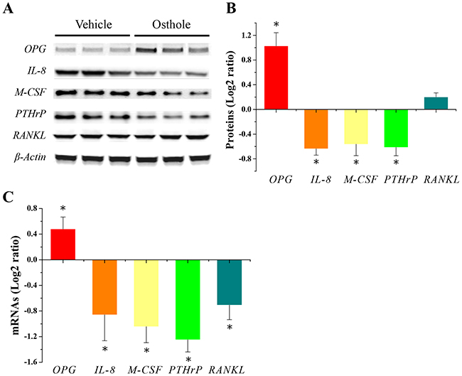 Figure 2: Alteration of bone metastatic and / or bone-related gene expression in osseous metastases. (A) Representative images of protein expression by western blotting (n = 3 for each group). (B) Quantitative results of protein expression were made by two image analysis experts using Image J software (National Institutes of Health, Bethesda, MD, USA) (log2-ratio vs. vehicle; mean ± SD). * p < 0.05 vs. vehicle. (C) Quantitative results of mRNA expression determined with RT-qPCR. RT-qPCR measurements (log2-ratio vs. vehicle; mean ± SD) in 6 individual mRNA samples obtained from bone metastasis lesions with or without osthole treatment. * p < 0.05 vs. vehicle. Mice were sacrificed at the end of treatment, and metastatic bone lesions were harvested and stored in liquid nitrogen. Frozen tissue was homogenized with a pestle and total RNA and protein were extracted for RT-qPCR and western blotting, respectively.