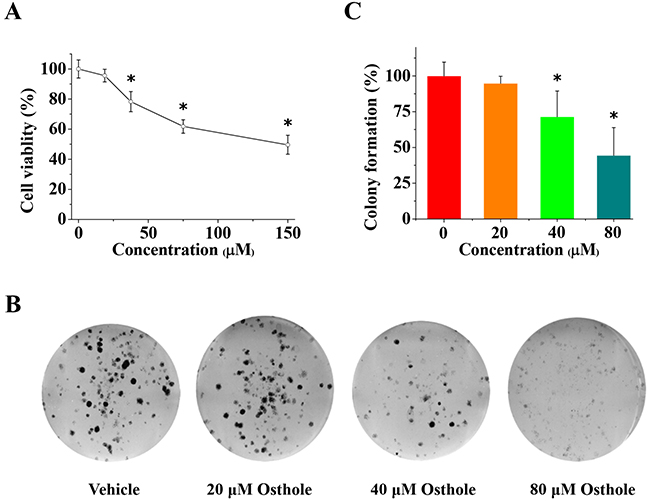 Figure 3: Osthole inhibited breast cancer cell viability and proliferation. (A) Osthole treatment inhibited MDA-231BO cell viability. Cells were treated with vehicle or osthole (18.75, 37.5, 75 and 150 μM) for 24 h and then measured using MTT assays. Results are expressed as mean ± SD for three experiments (* p < 0.05 by ANOVA). (B) Representative images from colony formation assays using cells treated with either osthole or vehicle were taken at 24 h. (C) Quantitative results of colony formation (% of vehicle) expressed as the mean ± SD of three experiments. * p < 0.05 vs. vehicle. Colony formation of vehicle-treated cells was set at 100 %, and values for colony formation of osthole-treated cells were represented as a percentage of vehicle colony formation (* p < 0.05 by ANOVA).