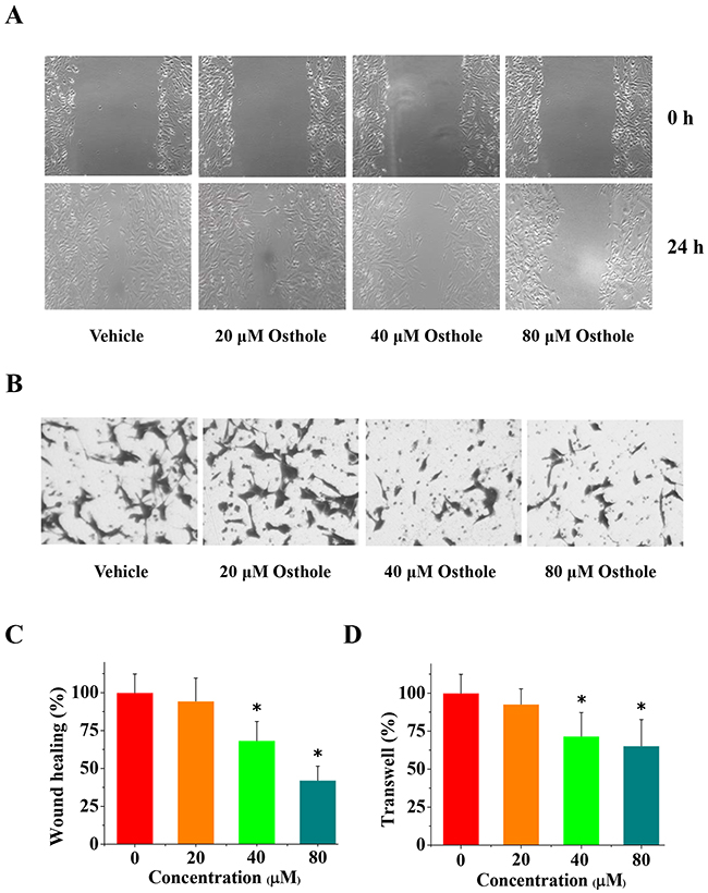Figure 4: The anti-invasion and anti-migration effects of osthole on breast cancer cells. (A) Representative images from wound healing assays using cells treated with either osthole or vehicle were taken at 0 h and 24 h. (B) Representative images of transwell analysis of cells treated with either osthole or vehicle were taken at 24 h. (C) Wound closure was quantified as the percentage of wound closure, and expressed as the mean ± SD of three experiments. Wound closure of vehicle-treated cells was set at 100 %, and wound closure of osthole-treated cells was represented as a percentage of the vehicle wound closure (* p < 0.05 by ANOVA). (D) Quantitative results of transwell migration assay (% of vehicle) expressed as the mean ± SD of three experiments. * p < 0.05 vs. vehicle. Transwell assay data, with vehicle-treated cells set at 100%, and osthole-treated cells represented as a percentage of the vehicle group (* p < 0.05 by ANOVA).