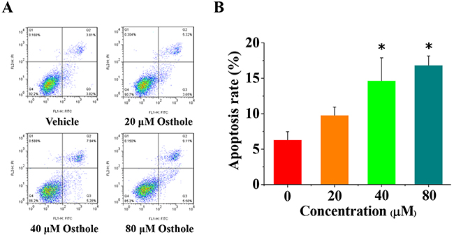 Figure 5: Osthole induced breast cancer cells apoptosis. (A) Representative flow cytometry analysis data from Annexin V-FITC/PI staining. Cell apoptosis levels from cells treated with either osthole or vehicle were assessed at 24 h. (B) Quantitative results of cell apoptosis determined using Annexin V-FITC/PI flow cytometry analysis and expressed as the mean ± SD of three experiments. * p < 0.05 vs. vehicle.