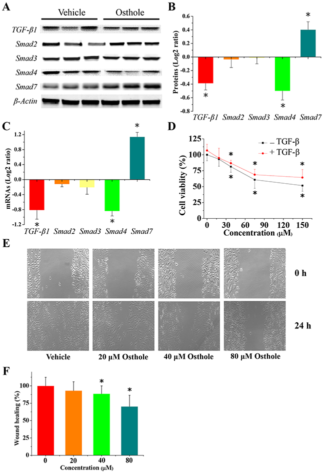 Figure 6: Alteration in gene expression of TGF-β/Smads signal pathway. (A) Representative images of protein expression detected by western blotting. Cells were treated with or without 80 μM osthole for 24 h. Protein lysates were separated by SDS-PAGE and subjected to western blotting analysis using the specific antibodies indicated. (B) Quantification of the results of the protein expression (log2-ratio vs. vehicle; mean ± SD). Scanning densitometry was used for semiquantitative analysis for comparison to the vehicle-treated group. Results are expressed as the mean ± SD from three experiments. * p < 0.05 vs. vehicle. (C) Osthole-regulated TGF-β and Smad family gene expression. Cells were treated with or without 80 μM osthole for 24 h. Cells were collected and total RNA was extracted and analyzed using RT-qPCR. Measurements for RT-qPCR (log2-ratio vs. vehicle; mean ± SD) in 6 individual mRNA samples obtained from MDA-231BO cells treated with or without osthole. * p < 0.05 vs. vehicle. (D) Osthole treatment inhibited MDA-231BO cell viability when pretreated with TGF-β1. Cells were pretreated with 2 ng/mL TGF-β1 for 3 h, then were treated with indicated concentration of osthole for 24 h, and finally were measured by MTT assays. Results are expressed as mean ± SD for three experiments (* p < 0.05 by ANOVA). (E) Representative images from wound healing assays using cells treated with either osthole or vehicle were taken at 0 h and 24 h, when pretreated with TGF-β1. Cells were pretreated with 2 ng/mL TGF-β1 for 3 h, and then incubated with or without the indicated concentrations of osthole. After 24 h treatment with or without osthole, wound healing assays were begun, and representative scrape lines were imaged. (F) Wound closure was quantified as percentage of the wound closure from the control group, and expressed as the mean ± SD of three experiments. (* p < 0.05 by ANOVA).