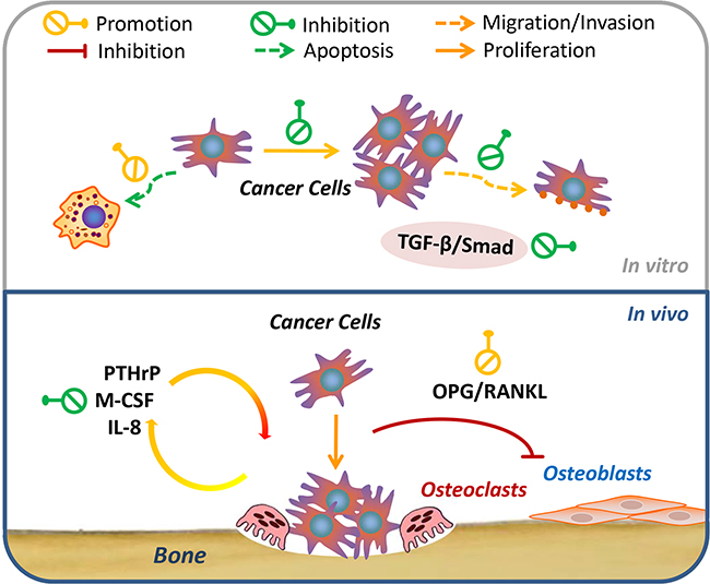 Figure 7: Schematic representation of the signaling pathways probably involved in osthole-mediated breast cancer bone metastasis. Osthole inhibited breast cancer cell growth, migration, and invasion, and induced apoptosis of breast cancer cells in vitro. Additionally, it probably regulated TGF-β/SMADs signaling in the metastasis of breast to bone cancer in MDA-231BO cells. Besides, it also altered pro-metastatic / bone metabolic genes and regulated OPG/RANKL signals in the interactions between bone cells (osteoblasts and osteoclasts) and cancer cells in vivo. The green and yellow symbols indicate the inhibitory and promoting effects of osthole, respectively. Abbreviations: IL-8, interleukin-8; M-CSF, macrophage colony-stimulating factor; OPG, osteoprotegerin; PTHrP, parathyroid hormone-related peptide; RANKL, receptor activator of nuclear factor kappa-B ligand; TGF-β, transforming growth factor-beta.