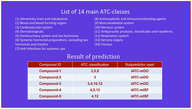 In a pioneer work, Dunkel et al. [1] proposed a computational method to identify the ATC classes of drug compounds based on their structural fingerprint information. Three years later, Chen et al. [2] developed an improved method by using the information of chemical-chemical interactions and chemical-chemical similarities. Actually, the ATC classification is a multi-label system [3], in which a same drug compound may belong to two or more different classes. To effectively deal with the difficulty caused by the multi-label nature, recently Cheng et al. [4] proposed a powerful predictor called “iATC-mISF” by incorporating the informations of the chemical-chemical interaction, structural similarity, and fingerprintal similarity into the sample formulation.