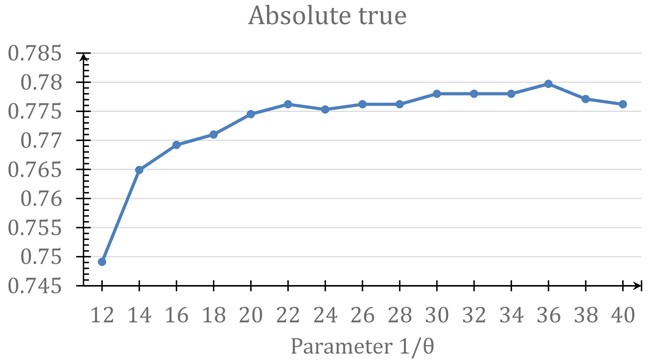 Since Eq.9 contains a parameter θ, the predicted results obtained by iATC-mDO will depend on the parameter’s value. In this study, the optimal value for θ was determined by maximizing the absolute true rate (see the 4th sub-equation in Eq.12) by the jackknife validation on the benchmark dataset . As shown in Figure 3, when θ = 1/36, the absolute true rate reached its highest score. And such a value would be used for iATC-mDO predictor in further study.