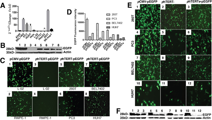 The resulting GFP reporter vectors, phTERT-pEGFP-N1 and phTERTe-pEGFP-N1, were transfected with lipo2000 (invitrogen) into individual tumor cell lines followed by GFP analysis. Briefly, GFP activity Detection by fluorescence microscope was normalized to the activity of phTERT promoter after 24-28h. Western blot analysis was processed to verify the expression level of GFP protein at the same time.