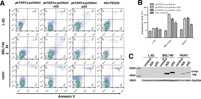 Figure 2: Detecting tumor targeting and cytotoxicity of ADI regulated by phTERTe promoter. Cells were transiently transfected by different plasmids including phTERTe-pcDNA4-ADI, phTERTe-pcDNA4-p53 and phTERTe-pcDNA4. Cell apoptosis ratio were checked by flow cytometry after 48h’s static cell culture. (A) Representative images of FACS analysis of annexin V and PI staining of L-02, BEL7402 and HUH7 cells. (B) Summary of FACS analysis from Figure 2A. (C) Immunoblots of ADI and p53 expression in L-02, BEL7402 and HUH7 cells. C-myc-tag antibody was used to detect c-myc-tag-fused ADI and p53.