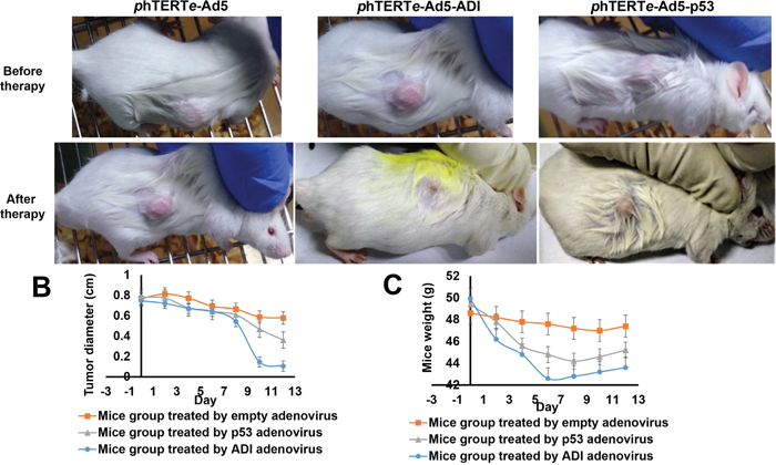 Figure 4: ADI adenovirus driven by phTERTe promoter successfully dissolved the tumors in mice hepatic tumor model. (A) Compared the therapeutic efficiency of ADI adenovirus and p53 adenovirus after the treatment for 6 days. (B) The changes of tumor sizes during gene therapy in mice model. (C) The changes of mice weights during gene therapy in mice model.