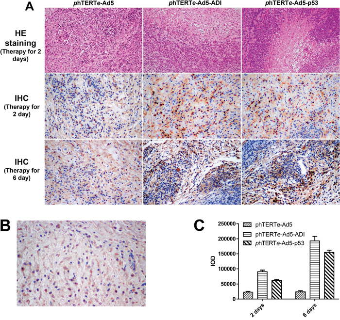Figure 5: HE and IHC staining of tumor tissues from gene therapy mice. (A) Detected the expressions of ADI and p53 protein by IHC staining. The tumors treated for 2 days or 6 days were cut out for HE and IHC staining. C-myc-tag antibody was used for IHC staining to detect cmyc-tag-fused ADI or p53 protein. (B) Blocking peptide control was used to verify the specificity of c-myc-tag antibody in IHC staining. A synthetic c-myc-tag peptide was used to block the activity of c-myc-tag antibody. (C) The expression quantifications of ADI or p53 protein were analyzed by Image-Pro Plus 6.0. IOD (Integrated Option Density) was checked out by calculating the area and the density of the brown color in IHC staining.