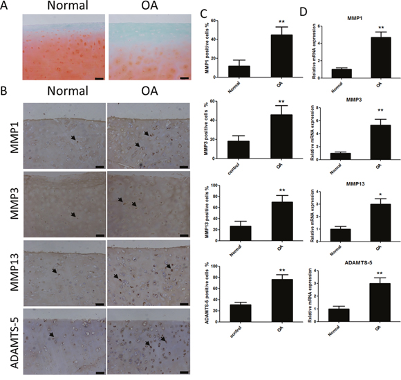 Figure 1: Safranin Orange staining and expression of catabolic proteases and extracellular matrix proteins in cartilage samples from human patients with or without osteoarthritis (OA). (A) Safranin Orange staining of cartilage samples from human patients with or without OA. Scale bar = 100 mm. (B) Immunohistochemistry of matrix metalloproteinase (MMP)-1, MMP3, MMP13 and A disintegrin and metalloproteinase with thrombospondin motifs (ADAMTS)-5 in normal and OA human cartilage samples. Scale bar = 100 mm. (C) Quantification of MMP1-, MMP3-, MMP13 and ADAMTS-5-positive cells in normal and OA human cartilage samples. (D) Relative mRNA expression of MMP1, MMP3, MMP13 and ADAMTS-5 in OA and normal human cartilage samples; n = 6, *p < 0.05 and **p < 0.01 (Student's t-test).