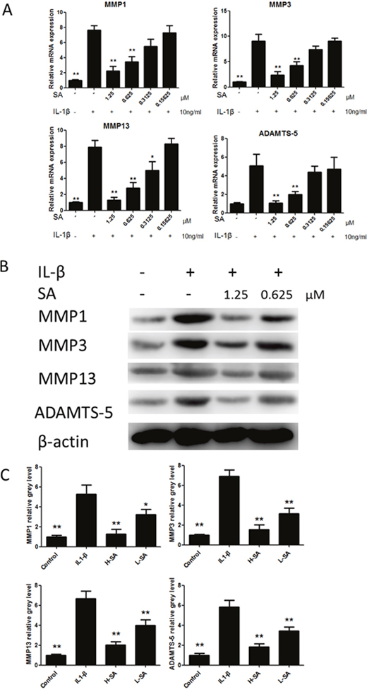 Effects of SA on IL1-β-induced MMP1a, MMP3, MMP13, and ADAMTS-5 expression in chondrocytes