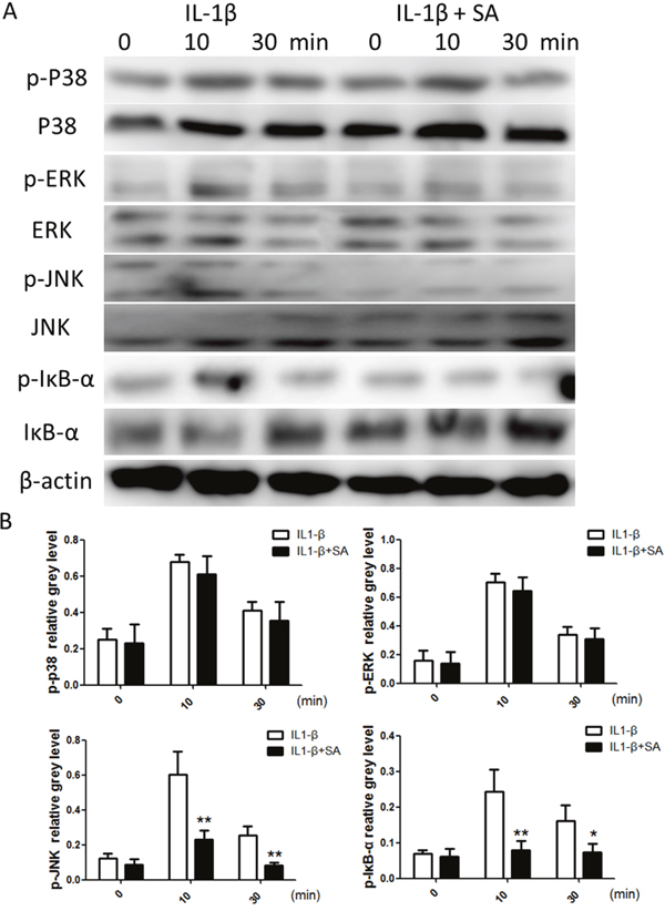 SA inhibits IL-1β-induced NF-κB and JNK activation in chondrocytes