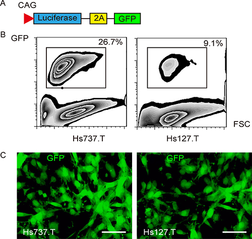 Figure 1: Labeling GCT cells with GFP and luciferase. (A) To allow tracing tumor formation in living mice and isolation of tumor cells from mice, we transduced the GCT cells with a lentivirus carrying both luciferase and GFP reporter under the control of a CAG promoter. The viral structure is shown. (B) The transduced GCT cells were purified based on GFP expression by flow cytometry. (C) The purified GFP+ GCT cells in culture. Scale bar is 20 μm.