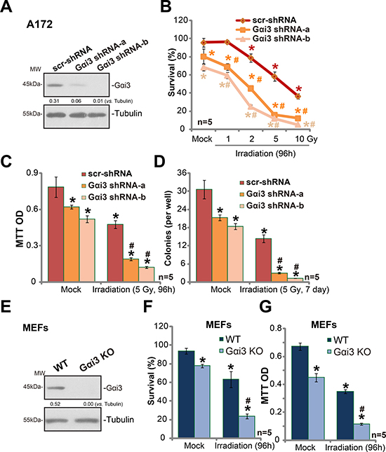 Figure 1: Silencing Gαi3 sensitizes irradiation-induced glioma cell death. Western blotting tested expression of listed proteins in stable A172 cells with Gαi3 shRNA (“-a/-b”) or scramble control shRNA (“scr-shRNA”) (A); A172 cells were also subjected to irradiation (at indicated intensity) and cultured for indicated time, listed assays were performed to test cell survival/death (B–D). Expression of listed proteins in wild-type (WT) and Gαi3 knockout (KO) MEFs was shown (E); MEFs were irradiated (5 Gy) and cultured for additional 96 hours. Afterwards, MEFs were subjected to trypan blue staining assay (F) and MTT assay (G). For all the assays, the exact same number of viable cells of different genetic background was initially plated into each well (Same for all Figures). Same set of lysate samples were run in sister gels (A and E). “Mock” stands for un-irradiated cells (Same for all Figures). “n = 5” means five replicate wells (Same for all Figures). Bars stand for mean ± SD (Same for all Figures). *p < 0.05 vs. “Mock” of “scr-shRNA” A172 cells or WT MEFs. #p < 0.05 vs. “Irradiation” of “scr-shRNA” A172 cells (B–D) or WT MEFs (F and G). Experiments in this figure were repeated three times, with similar results obtained.