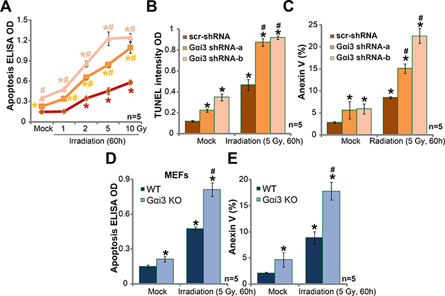 Figure 2: Silencing Gαi3 sensitizes irradiation-induced glioma cell apoptosis. A172 cells with Gαi3 shRNA (“-a/-b”) or scramble control shRNA (“scr-shRNA”) (A–C), as well as wild-type (WT) and Gαi3 knockout (KO) MEFs (D–E) were treated with irradiation (at indicated intensity) and cultured for additional 60 hours; Afterwards, cell apoptosis was tested by the listed assays. *p < 0.05 vs. “Mock” of “scr-shRNA” A172 cells (A-C) or WT MEFs (D–E). #p < 0.05 vs. “Irradiation” of “scr-shRNA” A172 cells (A–C) or WT MEFs (D–E).