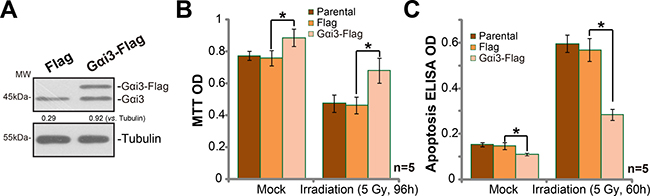 Figure 3: Exogenous Gαi3 over-expression in A172 cells cause irradiation resistance. (A) Western blotting analysis results showed expression of Gαi3 (endogenous and exogenous) in stable A172 cells with the Flag-tagged Gαi3 or empty vector (pSuper-puro-Flag, “Flag”). Cells were treated with irradiation (5 Gy) and cultured for indicated time; Cell death (MTT OD reduction, (B)) and apoptosis (Histone DNA ELISA assay, (C)) were tested. “Parental” stands for control parental A172 cells. *p < 0.05.