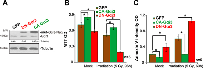 Figure 4: Irradiation sensitivity is altered with Gαi3 mutation in A172 cells. Western blotting assay results showed expression of Gαi3 (endogenous and mutant) in stable A172 cells with the dominant-negative Gαi3 (G202T, “DN-Gαi3”), the constitutively-active Gαi3 (Q204L, “CA-Gαi3”) or the empty vector (pGCL-GFP-puro, “GFP”) (A). Cells were also treated with irradiation (5 Gy) and cultured for indicated time; Cell death (MTT OD reduction, (B)) and apoptosis (Histone DNA ELISA assay, (C)) were tested. *p < 0.05.