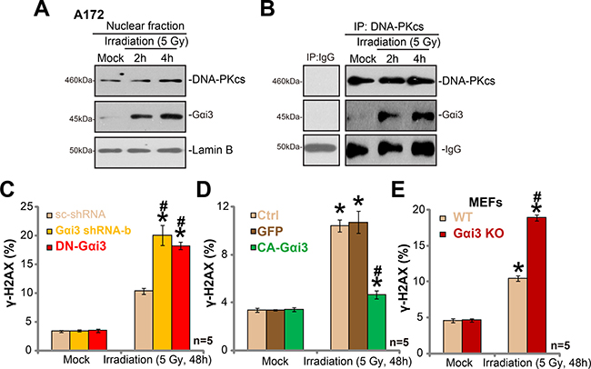 Figure 5: Irradiation induces Gαi3 nuclear translocation and association with DNA-PKcs. A172 cells were treated with irradiation (5 Gy) for 2 and 4 hours, nuclear fractions were isolated, expression of listed protein was tested (A) , Lamin-B is the nuclear marker protein). The association between DNA-PKcs and Gαi3 in cell nuclei was tested by Co-IP assay (B). Stable A172 cells with scramble control shRNA (“scr-shRNA”), Gαi3 shRNA (“-b”), the dominant-negative Gαi3 (G202T, DN-Gαi3) or the constitutively-active Gαi3 (Q204L, CA-Gαi3), as well as wild-type (WT) and Gαi3 knockout (KO) MEFs, were treated with irradiation (5 Gy) and cultured for 48 hours, DNA damage was tested by γ-H2AX FACS assay, and γ-H2AX-postive cell ratio was recorded (C–E). *p < 0.05 vs. “Mock”. # p < 0.05 vs. “Irradiation” of “scr-shRNA” A172 cells (C), “GFP” A172 cells (D) or WT MEFs (E).