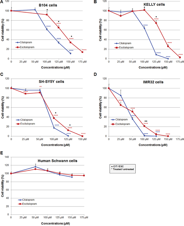Cytotoxicity of citalopram and escitalopram was assessed on a rat B104 neuroblastoma cell line, SH-SY5Y, IMR32 and Kelly human neuroblastoma cell lines and a primary human Schwann cell culture (HSC).