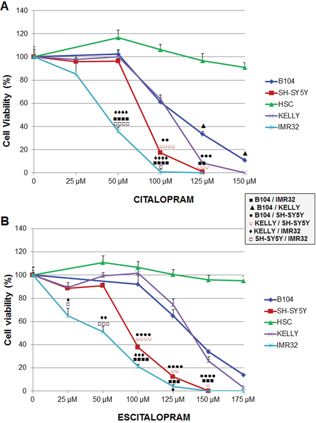 Figure 2: Sensitivity of B104, Kelly, SH-SY5Y and IMR32 neuroblastoma cell lines and human Schwann cells to citalopram or escitalopram. (A) Viability after 24 h treatment with citalopram. Cytotoxicity of citalopram was dose-dependent; IMR32 were the most sensitive cells. No cytotoxic effect of citalopram was measured on human Schwann cells. (B) Viability after 24 h treatment with escitalopram. Escitalopram cytotoxicity was dose-dependent. IMR32 were the most sensitive cells. No cytotoxic effect of escitalopram was measured on human Schwann cells. Data represent treated cell viability as a percentage to untreated cells and are presented as mean values +/- SEM.