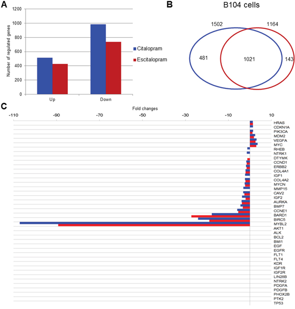 Figure 3: Modulation of gene expression by citalopram or escitalopram in B104 cells, Venn diagram, neuroblastoma prognostic marker gene expression. (A) Modulation of gene expression by citalopram (blue) or escitalopram (red) in B104 cells. Histogram shows the number of up-regulated and down-regulated gene. The spectrum of action of citalopram is broader than escitalopram. (B) Venn diagram showing gene modulation by 24 h treatment with citalopram (blue) or escitalopram (red), fold change ≥ 2, and p<0.05. 1 196 genes are regulated by both molecules whereas 504 are specifically modulated by citalopram and 109 by escitalopram. (C) Neuroblastoma prognostic marker gene expression after treatment with citalopram (blue) or escitalopram (red). Prognosis markers are classified according to their fold change, with max p<7.36 10-4. The action of citalopram is more intense, its spectrum of action broader than escitalopram.