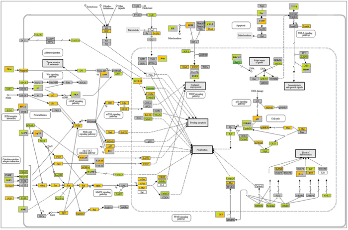 Figure 4: KEGG pathways in cancer. B104 cells. Gene expression modulations by citalopram and escitalopram. Orange: up-regulation; green: down-regulation; grey: no regulation. Upper left corner: regulation by citalopram; lower right corner regulation by escitalopram.