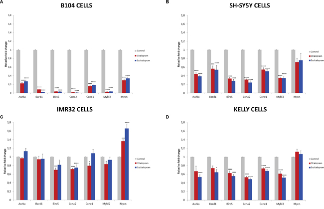 Our study was focused on the genes identified as prognosis markers and potential therapeutic targets of neuroblastoma [4, 5, 21, 23, 24]. Concerning poor prognosis factors, when gene expression was modulated by both citalopram and escitalopram, the action was always a decrease except for MDM2 and VEGFA. The action of citalopram was consistently more intense than escitalopram except for HRAS. The expression of 4 poor prognosis markers, MYBL2, BIRC5, BARD1 and AURKA were drastically decreased by both molecules using the microarray analysis. These data were confirmed by the qPCR analysis in rat B104, human SH-SY5Y and Kelly cell lines. In IMR32 cells, only BIRC5 was significantly down-regulated.