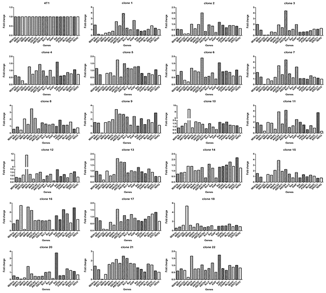 Figure 3: Relative levels of gene expression of clones from 4T1 cells. For each gene, there was a clone that had the lowest expression level. The fold change is based on the formula 2-[(ΔCT)clone(i)-(ΔCT)clone(a)] according to the method previously described [39], where, clone(i) denote any one of the 22 clones, and clone(a) denotes the one with lowest expression of a given gene. ΔCT was derived as described in Materials and Methods.