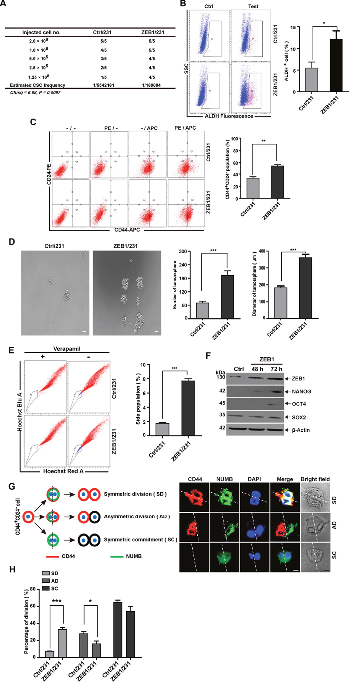 Figure 1: ZEB1 induces stemness properties in breast cancer cells. (A) For in vivo limited dilution assays, a total of 2×106, 1.0×106, 5×105, 2.5×105, and 1.25×105 ZEB1/231 or Ctrl/231 cells were injected into the mammary fat pads of nude mice. After 15 days, the mice were euthanized, and estimated CSC frequency was analyzed using ELDA software. Data were analyzed with chi-square tests (*P = 0.097). (B) and (C) Tumor tissues were prepared in single-cell suspension and processed for ALDH activity (B) and CD44+CD24- population (C) analysis by flow cytometry. *P < 0.05, **P < 0.01 vs. the respective control by Student’s t-test. (D) ZEB1/231 or Ctrl/231 cells were prepared in single-cell suspension and seeded in 24-well ultra-low attachment plates at 1,000 cells/well. Tumorsphere formation was examined after 14 days of culturing. ***P < 0.001 vs. the respective control by Student’s t-test. (E) ZEB1/231 or Ctrl/231 cells were stained with Hoechst 33342 in the presence or absence of verapamil. The side population fraction was examined by flow cytometry. ***P < 0.001 vs. the respective control by Student’s t-test. (F) The full-length ZEB1 expression plasmid was introduced into MDA-MB-231 cells. At the indicated time points, the expression of ZEB1, NANOG, OCT4, and SOX2 was assessed by immunoblotting and was normalized to the levels of β-Actin. (G) Schematic showing SD, AD, and SC patterns. (H) Confocal fluorescence images showing CD44 (red) and NUMB (green) intracellular distribution during the first cell division of the CD44+CD24- population isolated from ZEB1/231 and Ctrl/231 cells and cultured in suspension with blebbistatin treatment. The percentage of the SD versus AD populations was analyzed. *P < 0.05, ***P < 0.001 vs. the respective control by Student’s t-test. Scale bars: 20 μm.