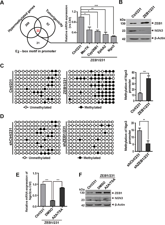 Figure 2: The Ngn3 promoter is a bona fide hypermethylation target of ZEB1. (A) Schematic representation of RRBS identification of the putative ZEB1 targets involved in breast tumorigenesis. Quantitative PCR were performed to verify the downregulation of MerTK, Cyp26B1, EphA2, and Ngn3 expression in ZEB1/231 vs. Ctrl/231 cells. *P < 0.05, **P < 0.01, ***P < 0.001 vs. the respective control by Student’s t-test. (B) The downregulation of NGN3 protein expression was assessed by immunoblotting in ZEB1/231 vs. Ctrl/231 cells and normalized to the levels of β-Actin. (C) and (D) The percentage of DNA methylation of the Ngn3 promoter was determined by BSP in ZEB1/231 vs. Ctrl/231 cells (C) and in shZEB1/231 vs. shCtrl/231 cells (D). **P < 0.01, ***P < 0.001 vs. the respective control by Student’s t-test. (E) and (F) ZEB1/231 and Ctrl/231 cells were treated with AZA (1.5 μM) and TSA (2 mM) for the indicated time points. The expression of Ngn3 was assessed by quantitative PCR (E) and immunoblotting (F) and normalized to the levels of β-Actin. ***P < 0.001 vs. the respective control by Student’s t-test.