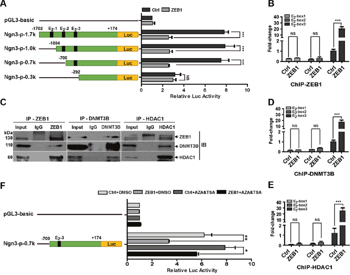 Figure 3: ZEB1 represses Ngn3 transcription via interaction with DNMT3B and HDAC1. (A) MDA-MB-231 cells were co-transfected with the ZEB1 expression plasmid and different wild-type or truncated Ngn3 promoter luciferase reporter constructs. Cell extract luciferase activities were determined 36 h after transfection using a Betascope analyzer. Luciferase values were normalized to Renilla activities. ***P < 0.001 vs. the respective control by Student’s t-test. (B) The overexpression of ZEB1 significantly enhanced its recruitment to the endogenous Ngn3 promoter, as confirmed by a quantitative ChIP assay using E2-box-specific primers. ***P < 0.001 vs. the respective control by Student’s t-test. (C) The interactions among ZEB1, DNMT3B, and HDAC1 protein were analyzed by co-immunoprecipitation in ZEB1/231 cells. (D) and (E) ZEB1 overexpression significantly enhanced the recruitment of DNMT3B (D) and HDAC1 (E) to the endogenous Ngn3 promoter, as confirmed by a quantitative ChIP assay using E2-box-specific primers. ***P < 0.001 vs. the respective control by Student’s t-test. (F) MDA-MB-231 cells were co-transfected with the Ngn3-p-0.7k reporter and the ZEB1 expression plasmid, and then treated with AZA and TSA. Cell extract luciferase activities were determined 36 h after transfection using a Betascope analyzer. Luciferase values were normalized to Renilla activities. *P < 0.05, **P < 0.01 vs. the respective control by Student’s t-test.