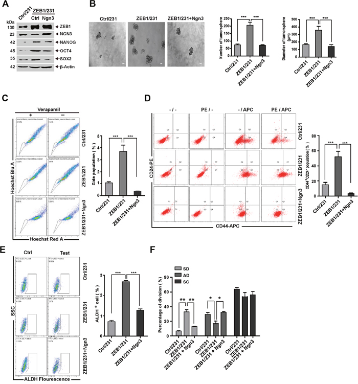 Figure 4: ZEB1/Ngn3 signaling affects breast CSC properties in vitro. (A) ZEB1/231 cells were transfected with an Ngn3 expression plasmid. The expression of ZEB1, NGN3, NANOG, OCT4, and SOX2 was assessed by immunoblotting and normalized to the levels of β-Actin. (B) to (F) Ngn3-mediated ZEB1 regulation of CSC properties was determined by analyzing tumorsphere formation (B), side population (C), CD44+CD24- population (D), ALDH activity (E), and SD population frequency (F). *P < 0.05, **P < 0.01, ***P < 0.001 vs. the respective control by Student’s t-test.