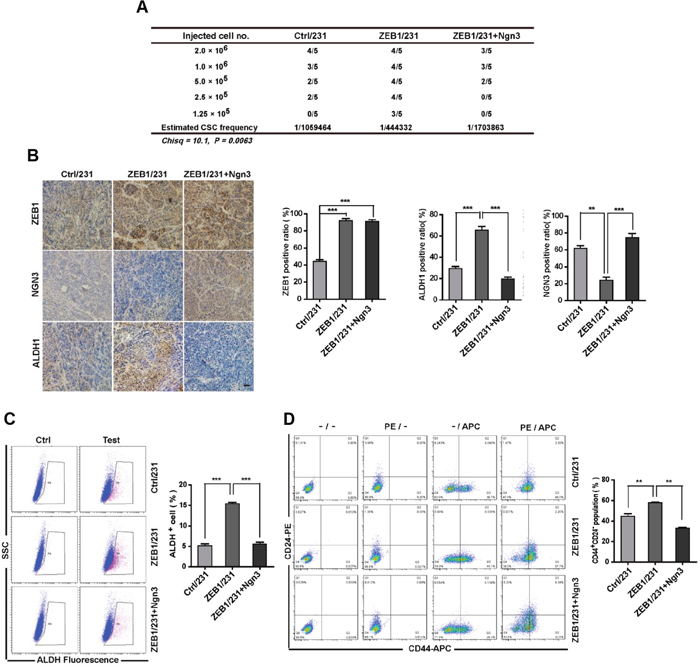 Figure 5: ZEB1/Ngn3 signaling affect breast CSC properties in vivo. (A) A total of 2×106, 1.0×106, 5×105, 2.5×105, and 1.25×105 ZEB1/231 cells with or without Ngn3 re-expression were injected into the mammary fat pads of nude mice. After 15 days, the mice were euthanized, and the estimated CSC frequency was analyzed using ELDA software. Data were analyzed with chi-square tests (*P = 0.0063). (B) The expression of ZEB1, NGN3, and ALDH1 in breast cancer xenografts was examined by immunohistochemical staining. Scale bars, 50μm. **P < 0.01, ***P < 0.001 vs respective control in Student’s t-test. (C) and (D) Tumor tissues were prepared in single-cell suspension and processed for ALDH activity (C) and CD44+CD24- population (D) analysis by flow cytometry. **P < 0.01, ***P < 0.001 vs. the respective control by Student’s t-test.