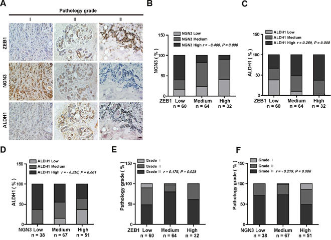 Figure 6: ZEB1 and NGN3 protein expression levels are inversely correlated in human breast cancer. (A) Representative images of immunohistochemical staining of ZEB1, NGN3, and ALDH1 in serial sections of the same tumor from three cases. Scale bars, 50 μm. (B) The expression score for NGN3 indicates a negative correlation with ZEB1 expression in the 156 human breast cancer samples analyzed. (C) The expression score for ALDH1 indicates a positive correlation with ZEB1 expression. (D) The expression score for ALDH1 indicates a negative correlation with NGN3 expression. (E) The expression of ZEB1 is positively correlated with the histological grades of breast cancer. (F) The expression of NGN3 is negatively correlated with the histological grades of breast cancer. All data were analyzed by Spearman’s rank correction test.