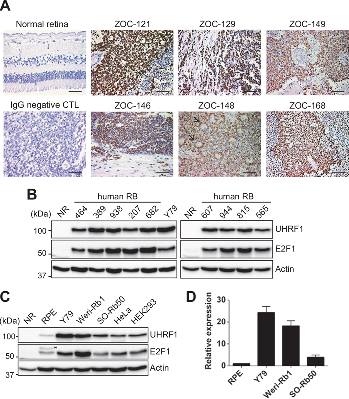 Figure 1: High expression of UHRF1 in primary retinoblastoma and cell lines. (A) Immunostaining of UHRF1 in human retinoblastoma and adult normal retina (42 years of age) sections with parallel negative control (CTL) staining with mouse IgG. Nuclei were counterstained with hematoxylin. Black arrows in ZOC-148 indicate rosettes characteristic of differentiated retinoblastoma. Scale bar: 50 μm. (B) Expression of UHRF1 and E2F1 in human primary retinoblastoma and normal retina (NR, 12 years) determined by immunoblots. (C) Western blot analyses for UHRF1 and E2F1 expression in retinoblastoma and other cell lines indicated. RPE: retinal pigment epithelium. * non-specific band. (D) qRT-PCR analysis of relative UHRF1 expression in cells indicated. The bar graph is shown as the mean ± standard deviation (SD) of fold changes from three independent experiments, relative to the normalized UHRF1 expression level in RPE.