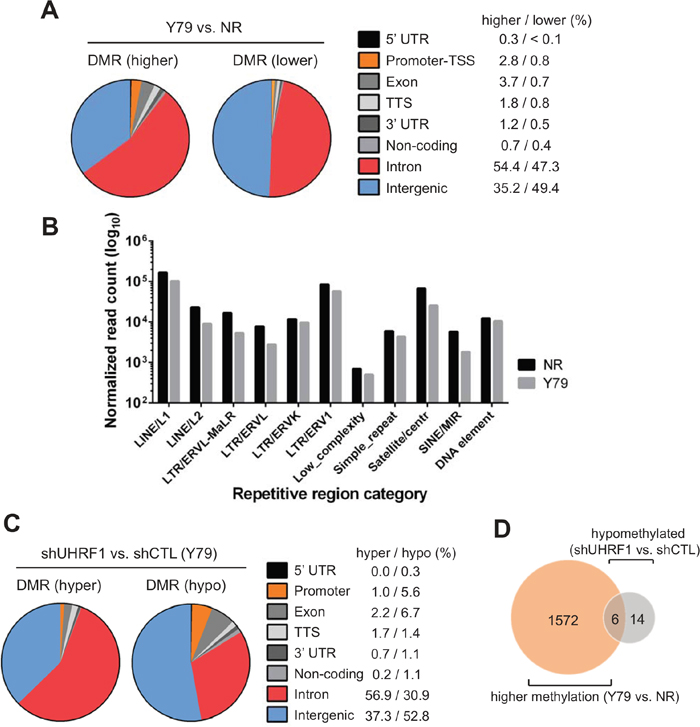 Figure 4: Genome-wide analyses of differentially methylated regions. (A) Distribution of differentially methylated regions (DMRs) in Y79 retinoblastoma cells as compared with normal retina (NR, 12 years). DMRs are divided into higher methylation (higher) and lower methylation (lower) regions in Y79, and their relative proportion on different genomic regions is shown as a pie chart with percentages of DMRs located at each category of genomic regions on the right. (B) Relative methylation differences in repetitive elements between NR and Y79. Sequence reads that are mapped to different classes of repetitive regions were normalized by the number of total mapped reads/106 of the corresponding libraries and represented in log10 scale on Y axis. (C) Distribution of DMRs in UHRF1 knockdown Y79 cells in comparison with control knockdown cells. Pie charts and the percentages are shown as in (A). (D) Venn diagram showing the overlap between the promoters with higher methylation in Y79 than in NR and hypomethylated promoters in UHRF1 knockdown Y79 cells in comparison with control knockdown.