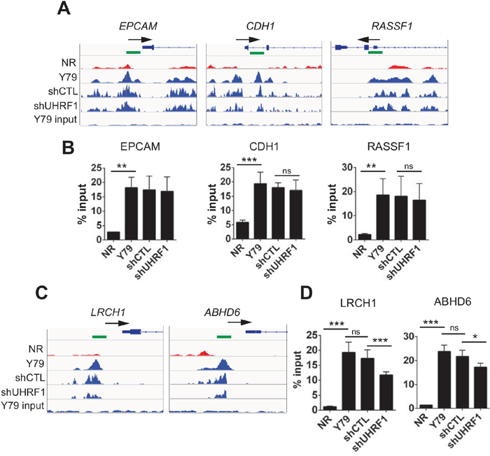 Figure 5: Effects of UHRF1 knockdown on promoter methylation of selected gene loci. (A, C) IGV browser tracks showing the distribution of 5meC signals on the indicated promoter regions in the five libraries as shown on the left. The NR indicates normal retina (12 years) and the identical retina tissue was used for the subsequent validation experiments. The shCTL and shUHRF1 represent the control and UHRF1 knockdown Y79 libraries, respectively. Maximal height of the tracks was set identically within the groups. Arrows mark the direction of transcription on the gene structure shown and green squares indicate the location of primers used for MeDIP-qPCR. (B, D) Validation of 5meC enrichment on the promoter regions shown in (A) and (C) by MeDIP-qPCR. The bar graphs are represented as mean ± SD of % input, and the statistical analysis was performed by unpaired student’s t-test (two-tailed). ** P < 0.01, *** P < 0.001, ns: not significant.
