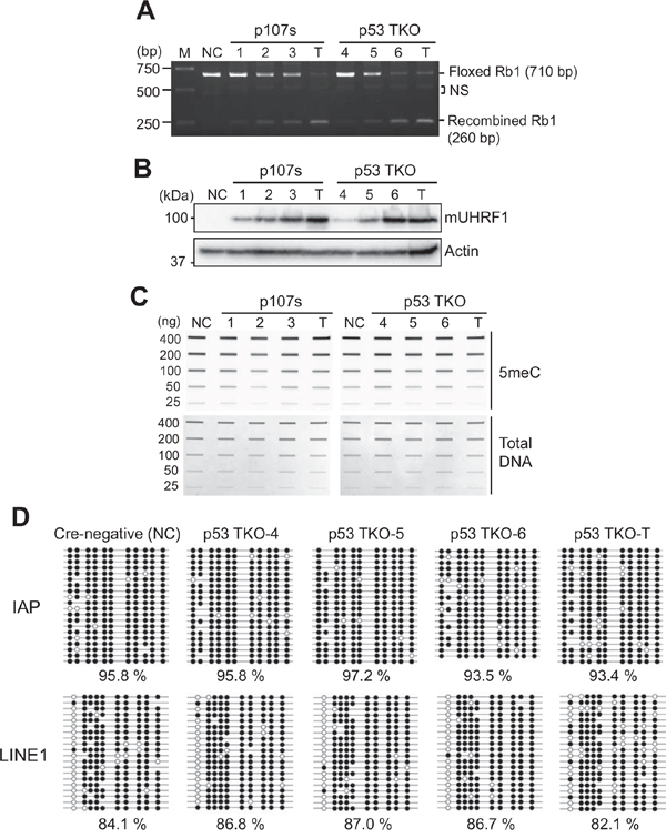 Figure 6: High UHRF1 expression does not change global DNA methylation in murine retinoblastoma models. (A) Genomic DNA PCR showing a different level of recombination in Rb1 allele by Chx10-Cre activity in the retina of two mouse retinoblastoma models (p107s and p53 TKO). P8 retina (1-3) and tumor (T) tissues of p107s (Chx10-Cre, Rb1lox/lox, Rbl2-/-, Rbl1+/-) were analysed in parallel with P8 retinae (4-6) and tumor (T) from p53 TKO (Chx10-Cre, Rb1lox/lox, Tp53lox/lox, Rbl1-/-). NC (negative control) indicates Cre-negative control retina of the p53 TKO line. The PCR product size of Rb1 allele flanked by loxP (Floxed) and recombined Rb1 is shown on the right. NS indicates non-specific bands. (B) Expression of mouse UHRF1 (mUHRF1) in the corresponding tissues shown in (A). (C) Slot blot analyses for the total 5meC level in the corresponding samples described in (A). (D) Bisulfite sequencing that shows methylation patterns at IAP and LINE1 for the p53 TKO P8 retinae (4-6) and tumor (T) shown in (C). Methylated and unmethylated CpG dinucleotides are represented by closed and open circles, respectively. Percentage of methylated CpG dinucleotides is shown below.