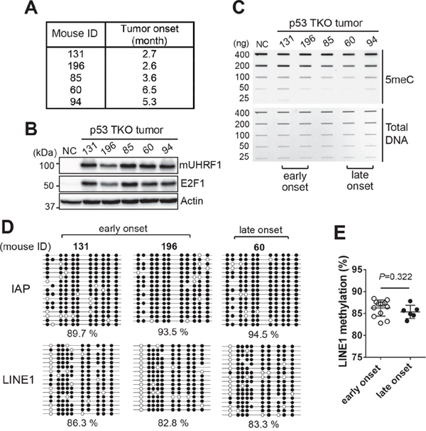 Figure 7: Global DNA hypomethylation may not be an early event leading to retinoblastoma development. (A) Table showing a representative set of p53 TKO mice with a different tumor onset time. (B) Expression of mouse UHRF1 (mUHRF1) and E2F1 in the tumors described in (A). NC indicates Cre-negative control retina of the p53 TKO line. (C) Slot blot analysis for the total 5meC level in the corresponding tumors described in (A). Early and late onset tumors are indicated at the bottom. (D) Bisulfite sequencing of IAP and LINE1 using the indicated mouse tumor DNA. Percentage of methylated CpG dinucleotides represented by closed circles is shown. (E) LINE1 methylation level in early onset (n=13) and late onset (n=6) p53 TKO tumors, determined by bisulfite sequencing. The graph is shown as the mean ± SD and the statistical analysis was performed by Mann-Whitney test (two-tailed).