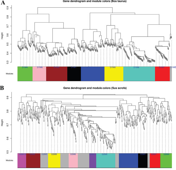 Figure 3: Module clustering tree of Bos taurus (A) and Sus scrofa (B). Different colours in module bar mean different modules. D1 and D2 refer to Bos taurus and Sus scrofa datasets, respectively. M1 to M11 mean different module numbers.