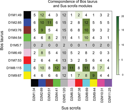 Figure 4: Correspondence of Bos taurus-specific modules and Sus scrofa-specific modules. Numbers in boxes refer to overlapped genes in every two modules. Color bar in the left means significance p value of module consensus,0-20 represents –log2(p value).