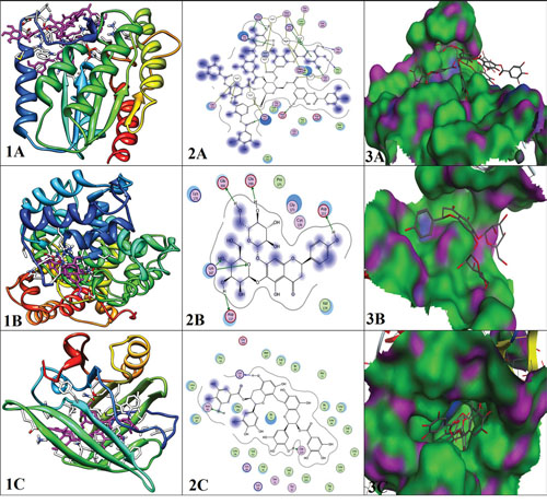 Figure 13: Interaction analys is of docked proteins; (A) (1, 2, 3) PAFAH1B1, (B) (1, 2, 3) PPP2R2B, (C) (1, 2, 3) PRM1.