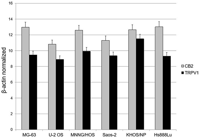 We performed a Real Time PCR to evaluate the expression of EC/EV system in untreated MG-63, U-2 OS, MNNG/HOS, Saos-2, KHOS/NP and Hs888Lu prior to the treatments, to be sure the receptors we were going to stimulate, were present. The result demonstrated the presence of mature mRNA for CB2 and TRPV1 receptors (Figure 1).