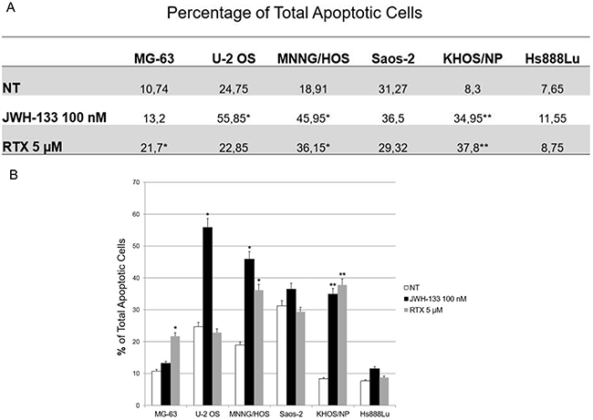 Figure 2: Effects of JWH-133 and RTX on apoptosis in OS cell lines. (A) Mean percentage of total apoptosis, of three independent experiment, induced by JWH-133 [100 nM] and RTX [5 μM], after 24h of exposure. The graph (B) represents the mean percentage ± SD of total apoptosis, of three independent experiment, induced by JWH-133 [100 nM] and RTX [5 μM], after 24h of exposure. A t-test has been used to evaluate statistical differences among the groups. * indicates p ≤ 0.05 compared to the untreated control (NT), ** indicates p ≤ 0.01 compared to the untreated control (NT).