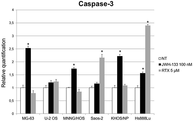 Figure 3: Effects on Caspase-3 mRNA expression levels of JWH-133 and RTX treatments. Caspase-3 mRNA expression levels in OS cell lines were determined by Q-PCR after JWH-133 [100 nM] and RTX [5 μM] treatments. Results were normalized for the housekeeping gene β-actin and were showed as mean ± SD of three independent experiments. A t-test has been used to evaluate statistical differences in Caspase-3 expression among groups. * indicates p ≤ 0.05 compared to the untreated control (NT).