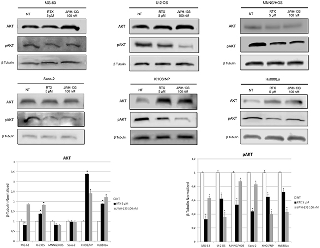 Figure 5: Effects of RTX and JWH-133 on AKT expression levels. Total Akt and pAkt protein expression levels in OS cell lines, were determined by Western Blot, starting from 15 μg of total lysates after JWH-133 [100 nM] and RTX [5μM] treatments. The results were normalized for the housekeeping protein β-tubulin. The graph represents the mean and S.D. from two experiments. A t-test has been used to evaluate the statistical differences in protein expression levels. * indicates p ≤ 0.05 compared to the untreated control (NT).