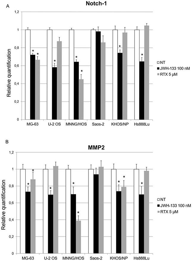 Figure 8: Effects of JWH-133 and RTX treatments, on Notch-1 and MMP-2 mRNA expression levels. Notch-1 (A) and MMP-2 (B) mRNA expression levels in OS cell lines determined by Q-PCR after JWH-133 [100 nM] and RTX [5 μM] treatments. Results were normalized for the housekeeping gene β-actin and are showed as mean ± SD of three independent experiments. A t- test has been performed to evaluate the statistical differences in the levels of gene expression among groups. * indicates p ≤ 0.05 compared to the untreated control (NT).