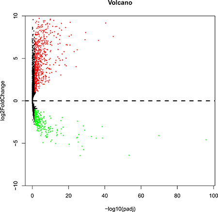 Figure 1: Volcano plot of the differentially expressed lncRNAs between LUSC and para-carcinoma tissues. Red indicates high expression and green indicates low expression. Black shows the lncRNA expression with both the log2FC < 1 and adjusted value < 0.05. The X axis represents an adjusted P value and the Y axis represents a log2FC. Differentially lncRNAs were calculated by DESeqR 2809 high expressed lncRNAs, and 1416 low expressed. This volcano plot was conducted by the ggplot2 package of R language.