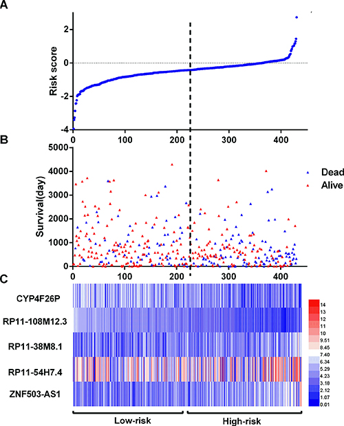 Figure 2: LncRNA risk score analysis of LUSC patients. (A) The low and high score group for the lncRNA signature in LUSC patients; (B) The survival status and duration of LUSC cases; (C) Heatmap of the five key lncRNAs expression in LUSC. The color from blue to red shows a trend from low expression to high expression.