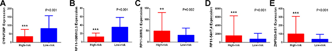 Figure 3: Different expression of the five key lncRNAs between high risk group and low risk group. (A) CYP4F26P; (B) RP11-108M12.3; (C) RP11-38M8.1; (D) RP11-54H7.4; (E) ZNF503-AS1 *P < 0.05, **P < 0.01, ***P < 0.001, ****P < 0.000.