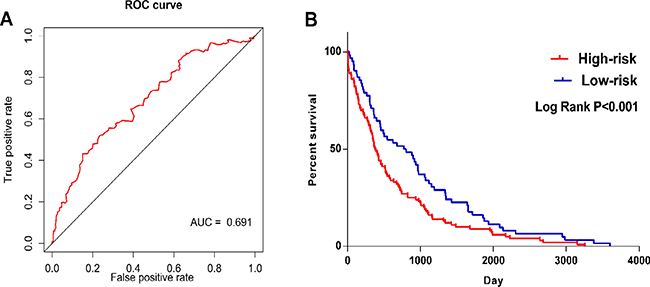 Figure 5: ROC and Kaplan–Meier curves for the five lncRNAs signature in TCGA LUSC cohort. (A) Time-dependent ROC curves analysis for survival prediction by the five-lncRNA signature. (B) Kaplan-Meier survival curves showing overall survival outcomes according to relative high-risk and low-risk patients.